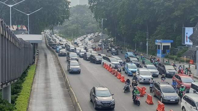 Pantauan detikcom, Selasa (2/5/2023), kemacetan terlihat dari Jalan Gatot Subroto mengarah ke Jalan Jenderal Sudirman. Para pengendara yang terjebak macet pun saling adu klakson.