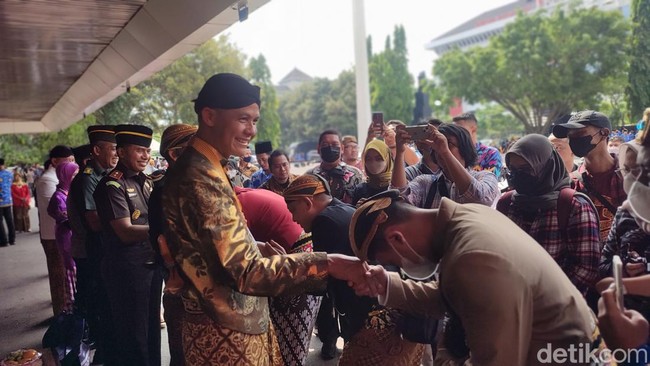 Ganjar terlihat mengenakan beskap kuning emas yang dipadukan dengan bawahan kain batik dan blangkon hitam di kepalanya. Ganjar juga didampingi istrinya, Siti Atikoh.