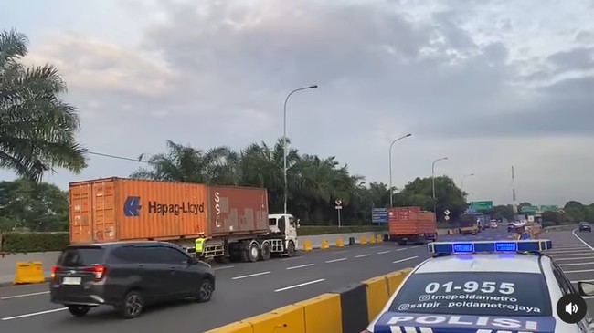 "#Polri Sat PJR Dit Lantas PMJ penertiban pengendara sopir truk yang parkir tidak pada tempatnya di bahu Jalan Tol Sedyatmo/Bandara Soetta Km 25.000," tulis akun Instagram TMC Polda Metro Jaya, Kamis (4/5/2023).