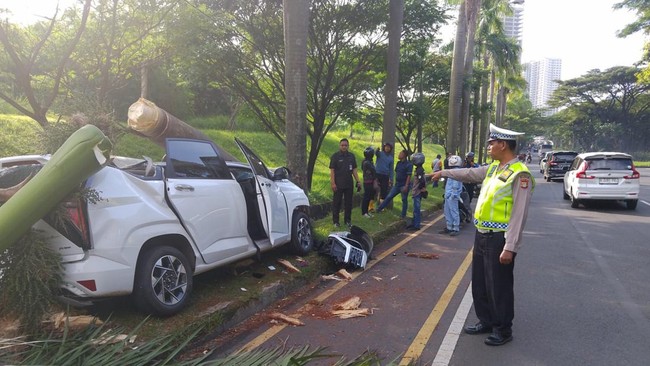 Sesampai di TKP, pengemudi tidak bisa mengendalikan kendaraannya dan oleng menabrak pohon palem hingga roboh. Selain itu, mobil yang menabrak pohon pun ringsek.
