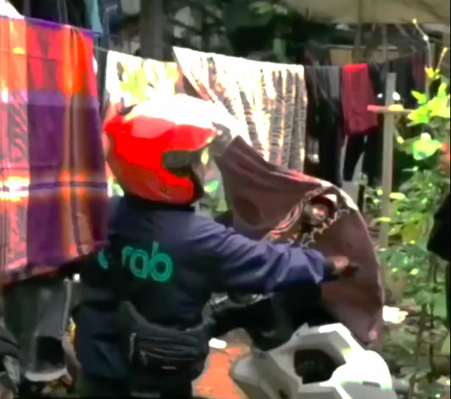 Pria pengendara motor menguntit seorang wanita hingga ke dalam kamar korban di rumahnya di Cileungsi, Bogor. Pria tersebut mengenakan jaket ojek online (ojol) bertulisan 'Grab'.