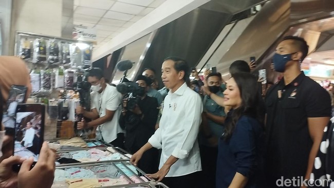 Presiden Joko Widodo (Jokowi) mengunjungi Pasar Tanah Abang, Jakarta Pusat, bersama Pj Gubernur DKI Jakarta Heru Budi Hartono. Penjaga toko di Tanah Abang pun senang bisa bertemu dengan Jokowi.