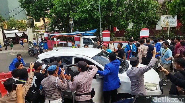 Massa PMII kemudian mengejar mobil tersebut. Massa memukul mobil hingga mengakibatkan pecah kaca di bagian depan.