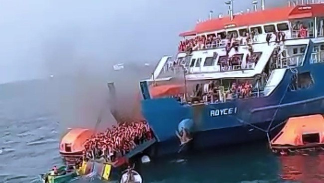 Kapal feri KMP Royce 1, yang membawa penumpang, terbakar di Laut Merak, Banten. Api yang membakar kapal feri tersebut sudah dipadamkan.