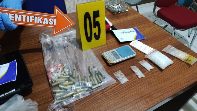 Dalam bungkusan plastik tersebut, berisi amunisi untuk senjata api jenis revolver kaliber 38 sebanyak 32 butir. Selain itu, ditemukan 4 plastik klip bening yang di dalamnya berisi butiran kristal putih dan 1 unit timbangan.