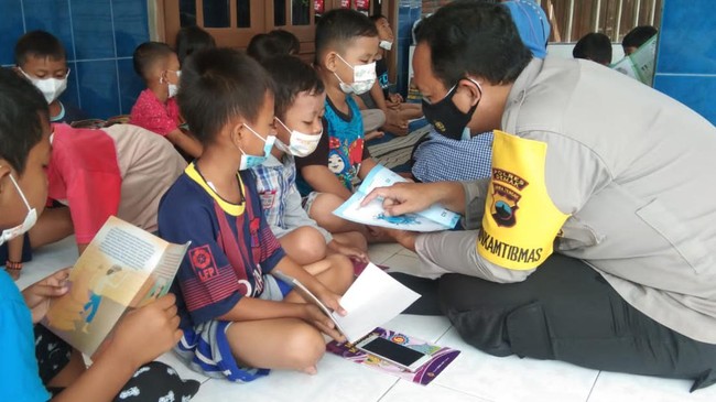 "Jadi setiap hari Minggu kita laksanakan keliling di gang, itu ada 7 gang. Jadi setiap minggunya pagi kita buka seperti lapak gitu, kita gelar tikar, terus kita ajak anak-anak. Anak-anak sendiri senang kalau kita datang, lalu kita berikan sedikit hadiah itu tanya jawab, hadiahnya itu nggak mahal-mahal cuma snack, nanti kita ngobrol bersama, kita bermain bersama," jelas Bripka Sugimin.
