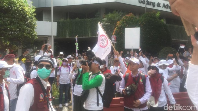 Dari Patung Kuda, massa bergerak ke kantor Kementerian Kesehatan (Kemenkes), Jalan Rasuna Said, Kuningan, Jakarta Selatan. Pantauan detikcom di lokasi, pukul 13.00 WIB, massa berbaju putih sudah memadati depan kantor Kemenkes.