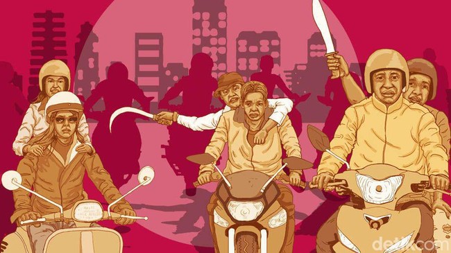 Dalam video yang dilihat detikcom, Senin (8/5/2023), terlihat tiga pria yang membawa senjata tajam jenis celurit berukuran besar. Mereka juga terdengar berteriak-teriak sambil menenteng senjata tajam.