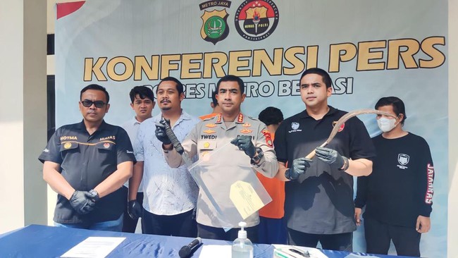"Pada saat korban sedang mengendarai sepeda motor, kemudian dipepet dan dihentikan oleh tiga orang laki-laki yang tidak dikenal, yaitu pelaku. Salah satu pelaku menodongkan sebilah celurit dan membacoknya ke arah badan belakang korban sebanyak satu kali," kata Twedi dalam konferensi pers di Mapolres Metro Bekasi, Selasa (9/5/2023).