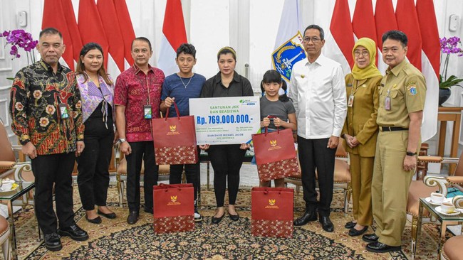 Penyerahan santunan diserahkan di Balai Kota DKI Jakarta pada Selasa (9/5/2023). Dalam kesempatan itu, Heru mengenang sosok David merupakan atlet berprestasi yang mengharumkan nama bangsa.