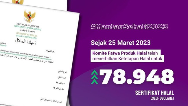 Kepala Badan Penyelenggara Jaminan Produk Halal (BPJPH) Muhammad Aqil Irham mengungkapkan hingga Selasa (9/5) Tim Pelaksana Tugas Komite Fatwa Produk Halal telah menerbitkan 78.948 sertifikat halal self declare. Hal ini berhasil dilakukan tim komite fatwa dalam waktu kurang 40 hari sejak menjalankan tugas perdananya pada Sabtu (25/3) lalu.
