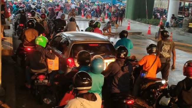 Dalam foto yang diunggah, terlihat kendaraan mobil dan motor menumpuk di jalur kiri. Sebab, jalan sebelah kanan diperbaiki.