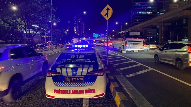 Dalam foto yang diunggah, mobil patroli polisi siaga di dekat Gerbang Tol Kuningan 2. Sementara itu, PT Jasa Marga melaporkan beberapa titik kepadatan di Tol Dalam Kota. Disebut, kepadatan terjadi di beberapa titik pada pukul 19.04 WIB.