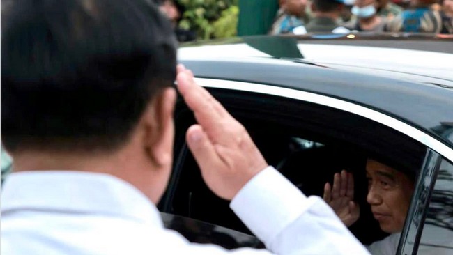 Dilihat detikcom, Selasa (16/5/2023), tampak Prabowo mengenakan baju putih hormat menghadap Jokowi, yang duduk di dalam mobil sembari hormat. Prabowo menuliskan keterangan lokasi foto tersebut.