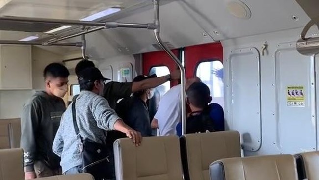 Sejumlah orang tampak menolong penumpang tersebut dengan membuka pintu kereta. Tak lama kemudian, pintu terbuka sehingga penumpang itu bisa keluar dari gerbong.