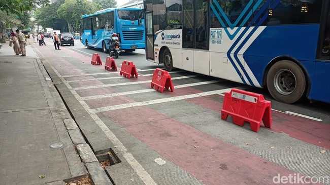 Terlihat barier berwarna oranye terpasang di sepanjang jalan. Sementara itu, sejumlah petugas Dishub berada di lokasi untuk mengatur lalu lintas.