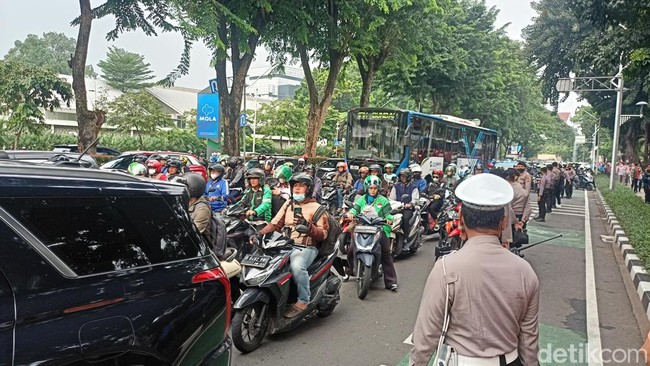 Pantauan detikcom pukul 07.55 WIB, di depan Gedung Kemenpora, tepatnya di Jalan Gerbang Pemuda, Jumat (19/5/2023), lalu lintas tampak macet. Sejumlah kepolisian berjaga di lokasi untuk mengatasi kemacetan.