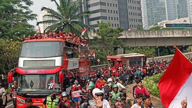 Rombongan tersebut menggelar arak-arakan dari Stadion Utama Gelora Bung Karno menuju Bundaran HI. Rute arak-arakan dimulai dari Kementerian Pemuda dan Olahraga (Kemenpora) menuju Jalan Sudirman hingga Bundaran HI.