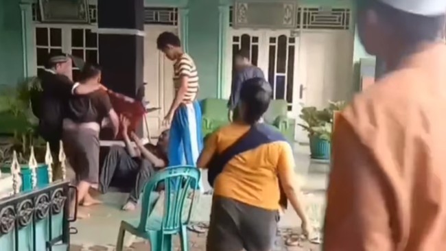 Seorang pria terlihat hendak menendang terduga pelaku, namun ia dilerai oleh warga lainnya. Pelaku yang terduduk di teras mencoba menghindar sambil menangis minta ampun.