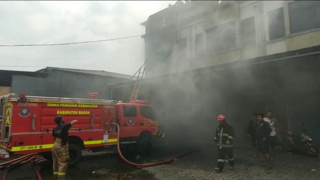 Ruko gudang bahan sepatu dan sandal di kawasan Ciomas, Kabupaten Bogor, terbakar. Api diduga diakibatkan oleh adanya korsleting di lantai dua.