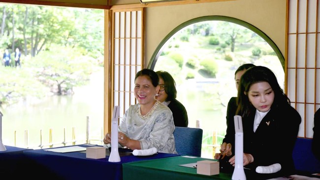 Tidak hanya itu, Iriana juga menikmati sajian makanan tradisional khas Jepang seraya berbincang hangat dengan para pendamping KTT G7 Outreach. Mengakhiri rangkaian kegiatan pada program pendamping, Iriana, Yuko Kishida dan para pendamping lainnya memberikan makan untuk ikan koi yang ada di kolam ikan di kawasan Shukkei-en Garden.