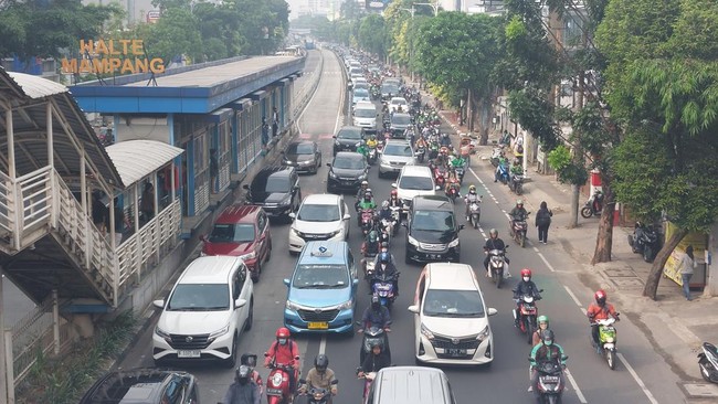 Pantauan detikcom, Selasa (23/5/2023), pukul 08.45 WIB di JPO Mampang Prapatan, Jakarta Selatan, terlihat antrean panjang kendaraan seperti yang biasa terjadi. Padatnya volume kendaraan memenuhi seluruh badan jalan.