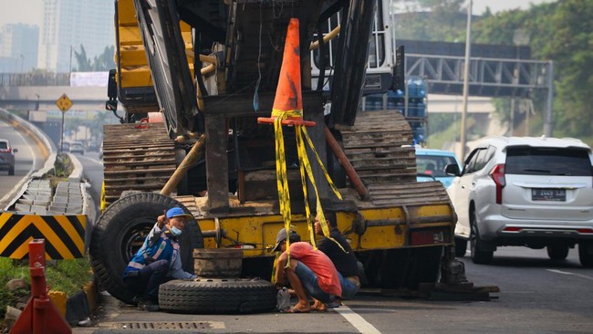 Pantauan detikcom, truk trailer patah baut roda di Tol JORR ruas Pondok Pinang, Jaksel, Selasa (23/5/2023) pukul 08.40 WIB. Truk yang mengalami gangguan tersebut berada di bahu jalan tol.