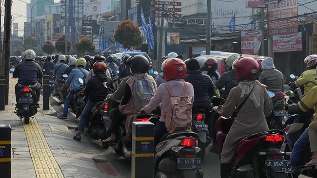 Pantauan detikcom, di Jalan Kartini, Kamis (25/5/2023), pukul 07.58 WIB, terlihat kemacetan mulai terjadi dari arah pintu keluar GDC menuju Jalan Kartini. Tampak Sejumlah pengendara motor nekat naik trotoar.
