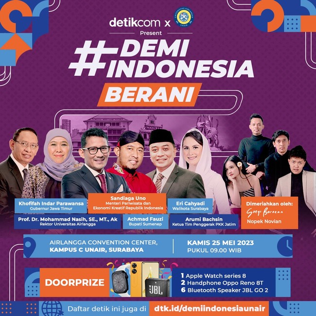 Nah, yang paling penting untuk kamu ketahui, acara ini GRATIS dan terbuka untuk umum, lho. Selain itu, ada banyak doorprize keren yang bakal dibagikan mulai dari 1 OPPO Find N2 Flip, 1 Apple Watch series 8, 2 handphone Oppo Reno 8T, dan 6 bluetooth speaker JBL GO 2. Jadi, jangan sampai ketinggalan ikutan #DemiIndonesia Berani di Unair!