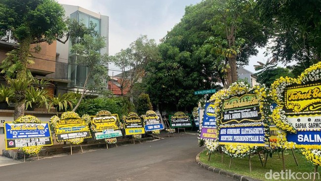 Pantauan detikcom di kediaman Sarwono, Jl Balitung III No 2, Kebayoran Baru, Jakarta Selatan, Sabtu (27/5/2023) pukul 14.15 WIB, karangan bunga ucapan dukacita untuk Sarwono terus berdatangan. Deretan karangan bunga itu memenuhi halaman rumah Sarwono hingga di ujung gang memasuki rumah tersebut.