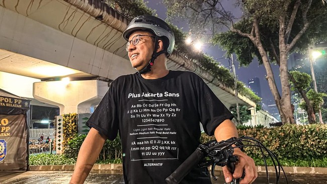 Anies terlihat mengenakan kaus hitam dengan tulisan 'Plus Jakarta Sans'. Font ini diketahui digunakan dalam slogan Kota Jakarta. Apa gerangan maksud Anies berpose demikian?