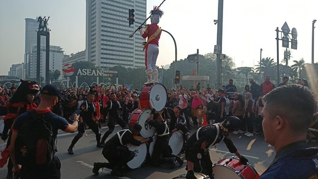 Rombongan marching band tersebut pun sempat melakukan atraksi di Bundaran HI. Warga pun bersorak-sorai menyambut atraksi tersebut.