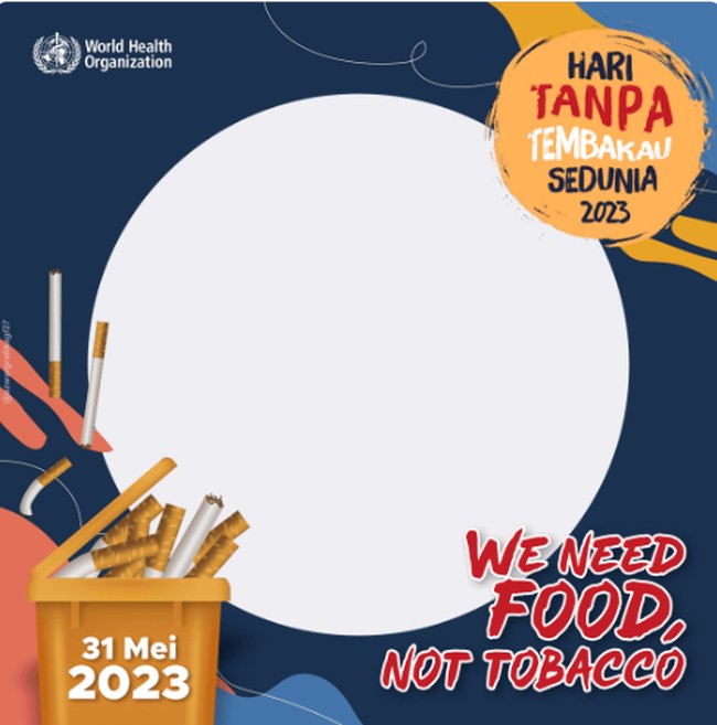 Hari Tanpa Tembakau Sedunia 2023 tahun ini mengusung tema "We need food, not tobacco" yang artinya "Kita butuh makanan, buka tembakau". Untuk merayakan peringatannya, di bawah ini adalah sederet twibbon Hari Tanpa Tembakau Sedunia 2023.