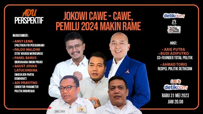 Adu perspektif malam ini membahas "Jokowi Cawe-cawe, Pemilu 2024 Makin Ramai" bersama Direktur Eksekutif Parameter Politik Adi Prayitno, Stafsus Faldo Maldini, Waksekjen Partai Demokrat Agust Jovan Latuconsina, Ketua Musra Panel Barus dan Politikus PDI Perjuangan Ansy Lema. Acara disiarkan secara langsung dari detikcom dan seluruh kanal sosial media detikcom, Rabu (31/5/2023).