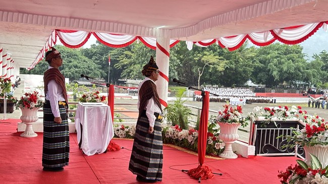 Pantauan detikcom di lokasi, Kamis (1/6/2023) Mahfud mengenakan pakaian adat Ende Lio lengkap dengan lesu di kepala. Hadir pula Wakil Gubernur NTT Joe Nae Soi mengikuti upacara.