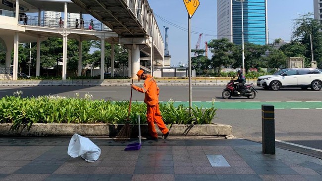 Salah satu pasukan oranye, Atika (48) menyebut lalu lintas di kawasan Sudirman-Thamrin hari ini masih tergolong ramai. Menurutnya, kondisi lalu lintas pagi ini tak berbeda jauh saat libur hari Sabtu.