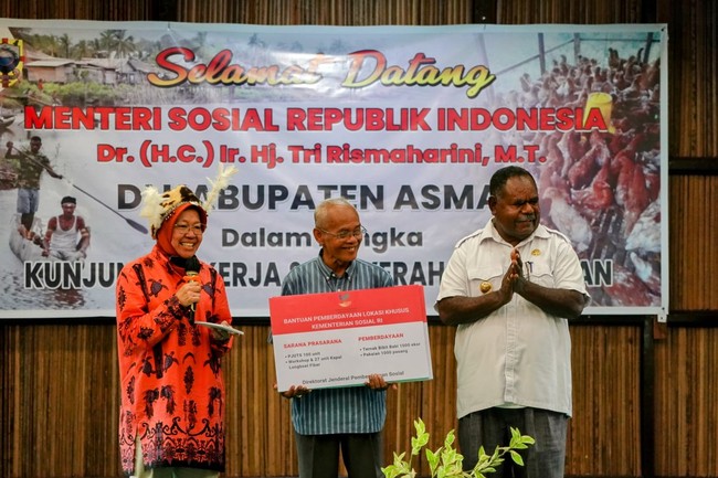 Sebagai informasi, rincian bantuan Kementerian Sosial yang diserahkan ke penerima manfaat melalui Keuskupan Agats yakni 27 kapal fiber glass long boat, bantuan stimulan pemberdayaan ternak babi sepasang kepada 500 penerima manfaat, sarana dan prasarana seperti PJUTS, workshop kapal fiber glass, dan pakaian harian untuk 500 penerima manfaat.