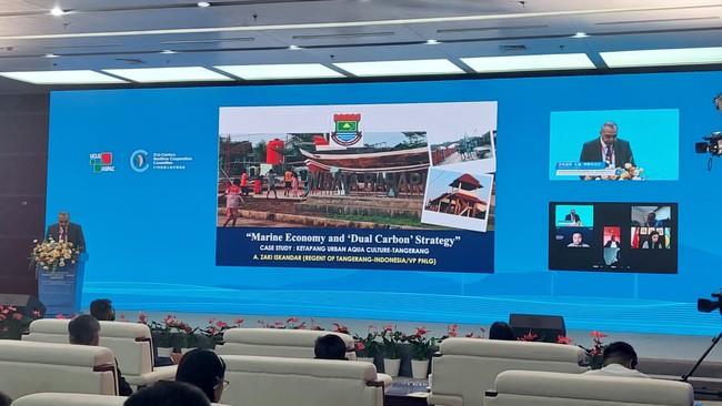 Bupati Tangerang sekaligus Wakil Presiden PEMSEA Network of Local government (PNLG) Ahmed Zaki Iskandar memaparkan peran dan kontribusi PLNG dalam pengelolaan wilayah pesisir. Hal ini disampaikan dalam Forum Marine Economy and Dual Carbon Strategi of 21st Century Maritime Cooperation Committee, di Fuzhou, Cina, Jumat (2/6).