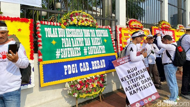 Pantauan detikcom di depan gedung DPR, Jl Gatot Subroto, Jakarta Selatan, Senin (5/6/2023) pukul 09.40 WIB, karangan bunga tersebut berjejer memenuhi gerbang utama gedung DPR. Massa tenaga kesehatan terlihat tengah menggelar orasi di depan gedung wakil rakyat itu.