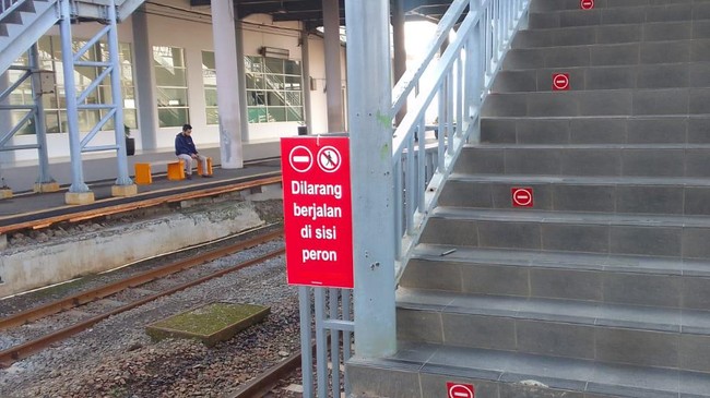 Selain itu, tampak tulisan peringatan 'Dilarang berjalan di sisi peron'. Penutupan ini berada di sisi tangga tempat keluarnya penumpang dari arah gerbong 7 hingga 1.