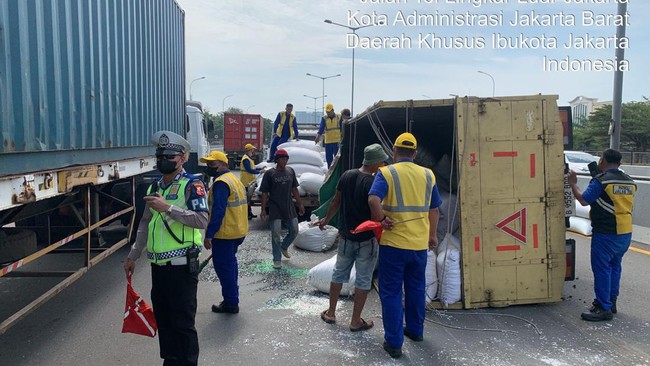 Sebuah truk bermuatan beras dilaporkan terguling di Km 4 B Tol Jakarta Lingkar Barat tadi siang. Muatan beras yang diangkut pun berceceran di ruas jalan.