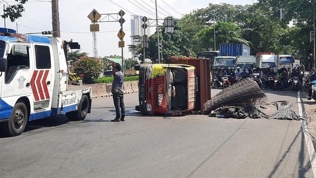 "Nggak tahu tergulingnya karena apa, nggak kelihatan ada korban sih. Muatan besi-besi kayak bahan konstruksi gitu sih, kawat, besi-besi," ujarnya.