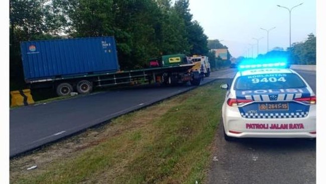 Posisi akhir kendaraan normal di rerumputan menghadap arah barat. Petugas kemudian mengevakuasi truk tersebut.