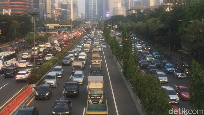 Ruas jalan dipenuhi berbagai kendaraan, dari motor, mobil, hingga bus TransJakarta. Kendaraan melambat di kawasan Semanggi. Suara klakson juga bersahutan saat laju kendaraan stuck. Penampakan yang sama juga terlihat pada lalin dari Slipi menuju Cawang.
