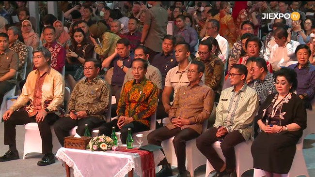 Presiden Joko Widodo (Jokowi) menghadiri pembukaan Jakarta Fair 2023. Jokowi ditemani Pj Gubernur DKI Jakarta Heru Budi Hartono hingga Ketua Mahkamah Konstitusi (MK).