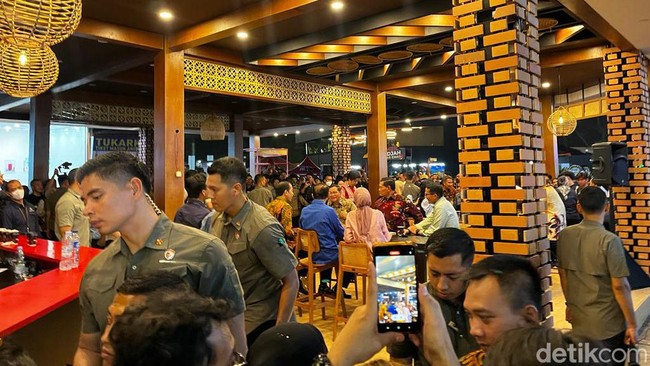 Tampak Menparekraf Sandiaga Uno, Sekretaris Kabinet Pramono Anung, dan Panglima TNI Yudo Margono ikut dalam rombongan dan duduk di meja yang sama. Sesekali mereka terlihat tertawa sambil berbincang.