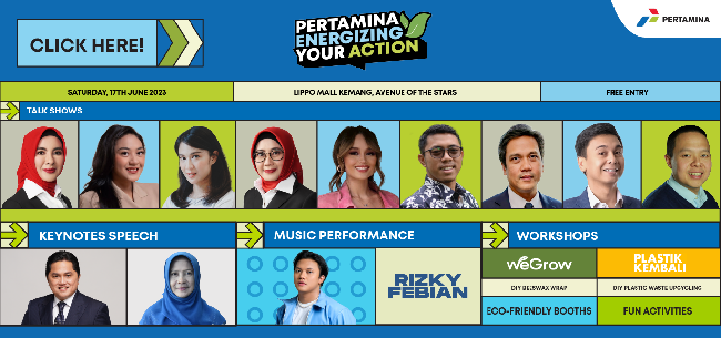 "Terdapat tiga talk shows dalam main event Pertamina Energizing Your Action. Talk shows tersebut diantaranya 'We Are The Forefront Of Change', 'Giving Back To The Community, Giving Back To The Environment', dan 'Climate Change: The Clock Is Ticking'," tulis Pertamina.