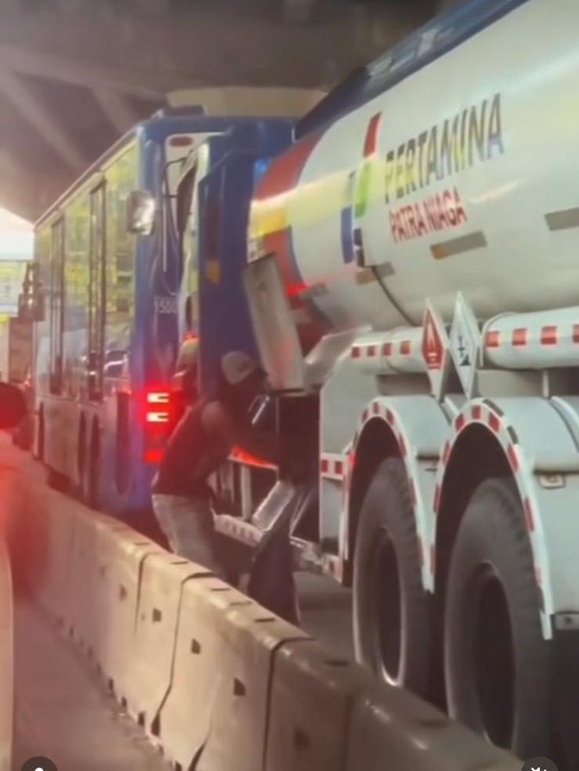Dari video yang beredar, Sabtu (17/6/2023), tampak seorang pria berada di samping truk tanki berlogo Pertamina. Ia membawa botol 1,5 liter, plastik hitam, dan selang.