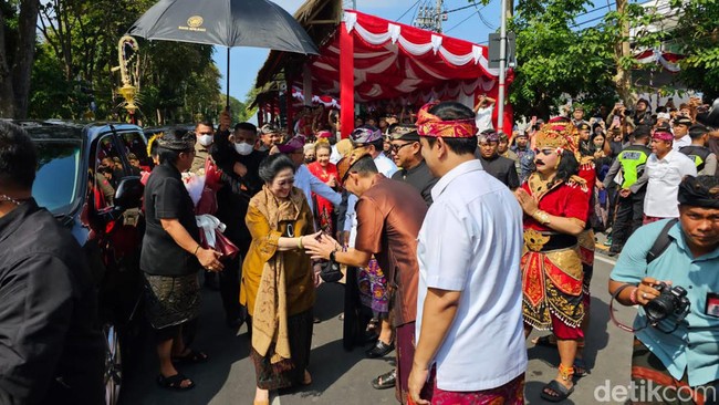 Megawati nampak disambut langsung Sandiaga Uno saat tiba di lokasi. Tak hanya itu, hadir pula Menteri PUPR Basuki Hadimuljono, hingga Gubernur Bali Wayan Koster. Para hadirin yang datang nampak kompak mengenakan pakaian adat khas bali.