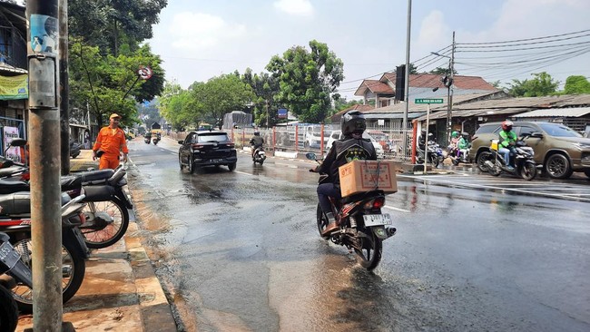 Kendaraan terlihat bisa melintas tapi harus mengurangi lajunya akibat genangan. Petugas Dishub, Ridwan, mengatakan genangan terjadi sejak pukul 09.00 WIB. Ketinggian air sempat mencapai sekitar 30 cm.
